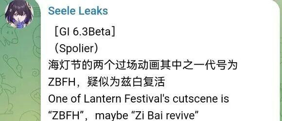 目前大佬的最新爆料是海灯节会有两个过场动画,其中一个过场动画的代号名称为兹白复活,而兹白就是白马仙人,那么这个动画基本就讲述了关于兹白是如何复活的一个剧情故事。