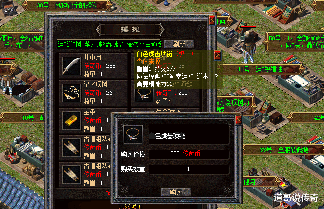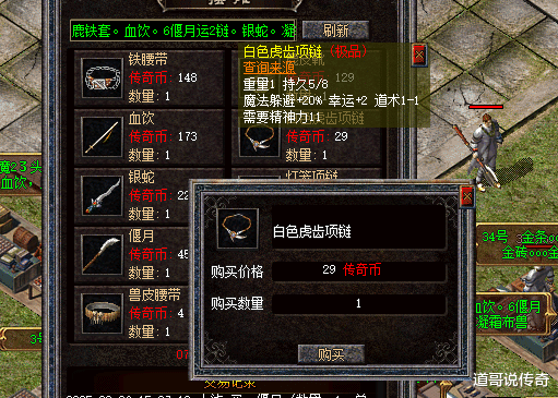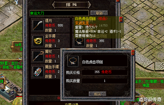 和前面的运2项链相比,上图中的这根白色虎齿项链还多加了1点道术属性上限,对于道士而言在输出方面确实很不错。只不过新百区的道士多是敏捷套装搭配,真正搭配运九套或者十套的很少,因此这根项链属性不错但不热门,就摆摊200了。
