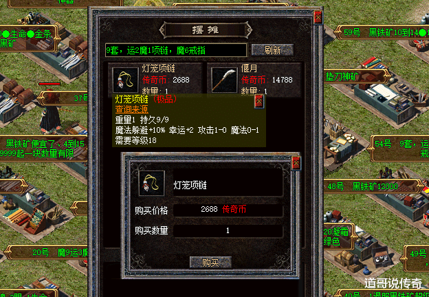 前面都是白色虎齿项链,而上图中来了一根灯笼项链,它加了2点魔法属性和1点魔法属性,同样是加了3点属性,但是它摆摊2688。目前新百区的战法职业是最热门的,在运2链子基础上也就战士有一根攻2灯笼,价值不可估量,而法师运2项链最多也就1点魔法属性加持,因此这根运2魔1灯笼项链才能放出2000+的数字,确实厉害。
