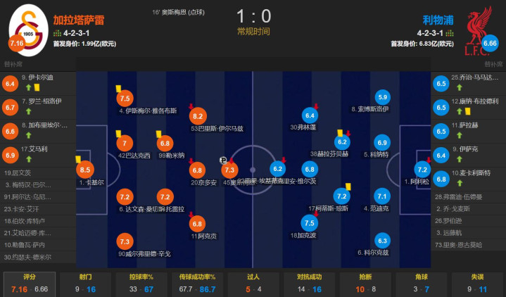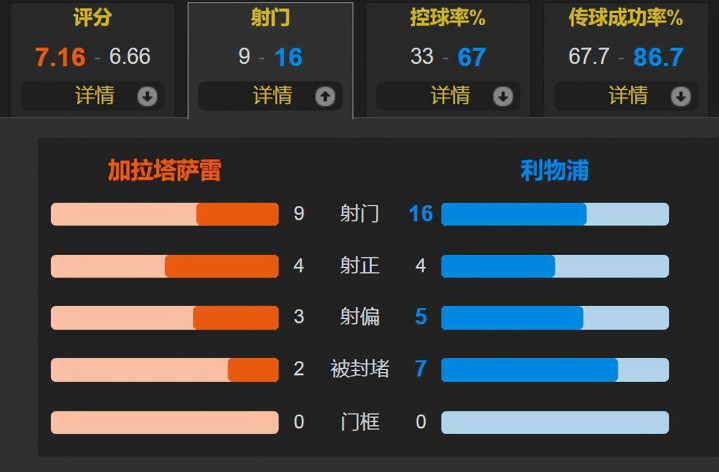 全场比赛,利物浦的控球率为67%,一共有16次射门,比加拉塔萨雷多了7次,但双方都是4次射正。