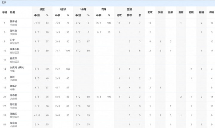 北京队方面,隰泰诚16分7篮板3助攻,偰李永炜17分6篮板2助攻,汪志鹏14分3篮板1助攻。