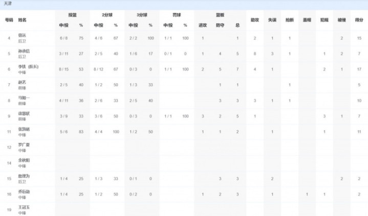 天津队方面,李铁17分7篮板4助攻,毋远15分1篮板2助攻,张凯铭11分2篮板。