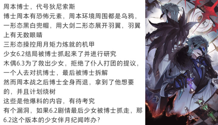 好消息是有关6.2提到博士的文本已经有了!当哥伦比娅踏入「亥珀波瑞亚」遗迹中的那道光束后,却并没有回归月亮,而是被束缚在了愚人众执行官「博士」多托雷手下。
