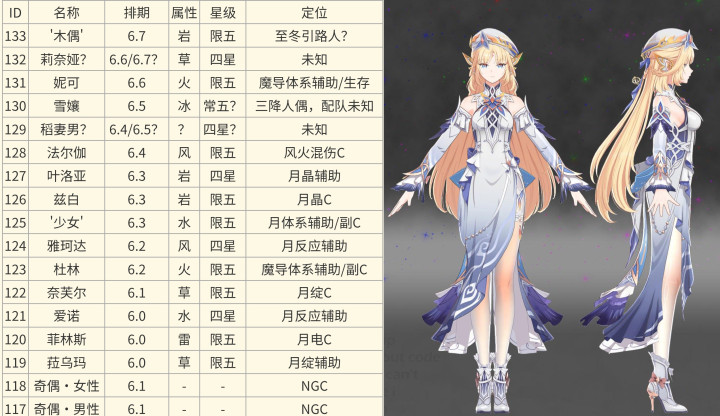 另外就是角色名单编号也进行了更新,新增了两位新四星角色的编号,同时尼可的编号也被确定下来了!大概就是以上这些了,目前挪德卡莱17位自机角色基本明朗,6.4开始是魔导主场!6.6的雪女会是今年的空降新常驻!后续还有稻妻少年+莉奈娅两位新四星入池,尼可属性确定为火系法器,定位是辅助,很有可能会是大香班!