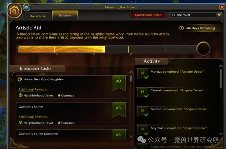 目前玩家已经挖掘出 10 种不同的社区行动,还有 174 个小任务,涵盖的范围特别广:从在社区里完成活动,到在社区周边送信,甚至还要回以前资料片的地图怀旧—— 比如去《巨龙时代》的查拉雷克洞窟完成 “战火中的研究者”事件。