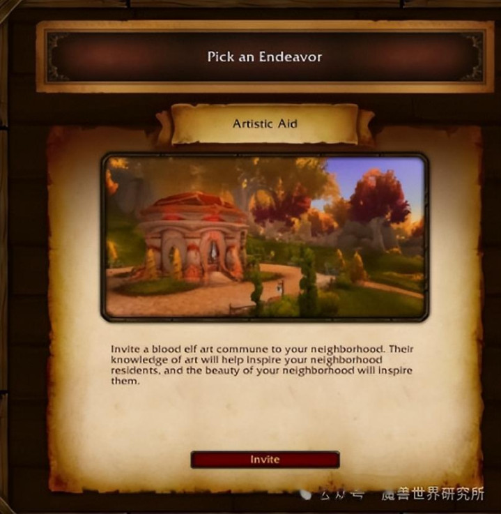 “艺术支援”:血精灵艺术公社因为家园被攻击,暂时躲在社区里,他们愿意教大家艺术技巧 。