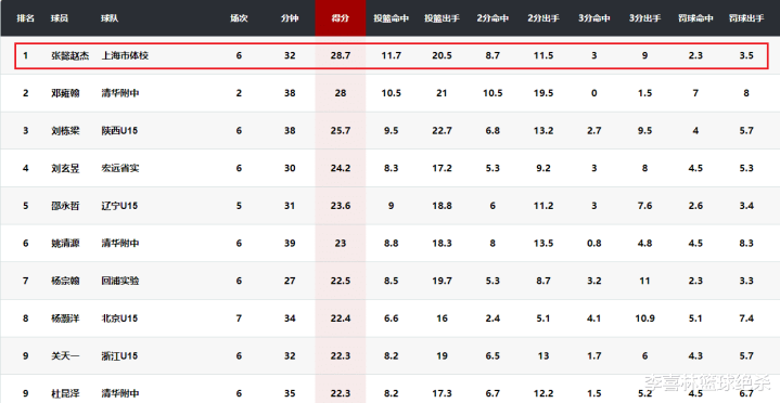 在这届赛事中,张懿赵杰场均得到28.7分10.2篮板3.7助攻2.5抢断1.2盖帽,投篮命中率56.9%,三分命中率33.3%,罚球命中率66.7%。他的场均得分排名这届赛事第一,加冕了得分王。